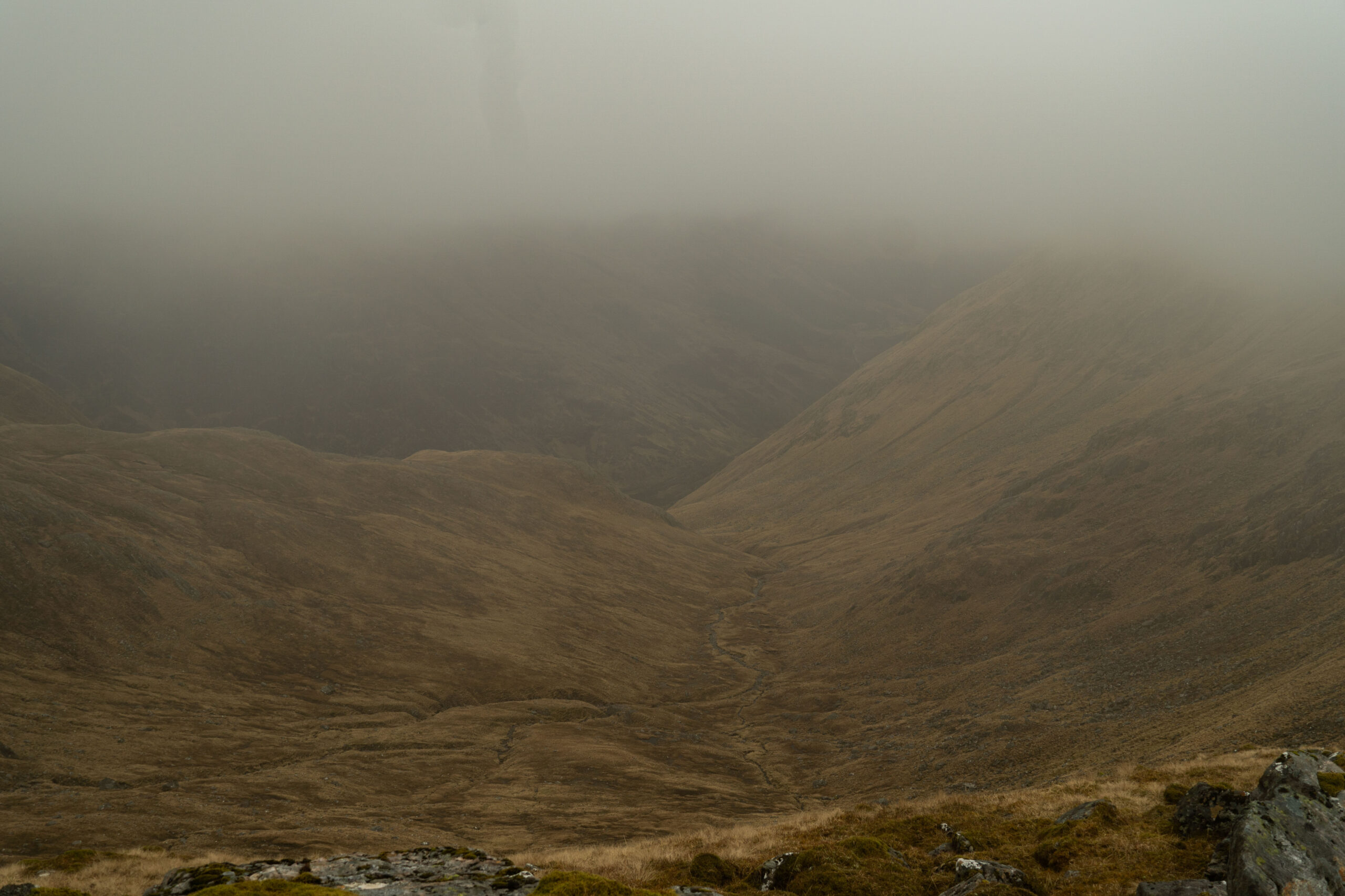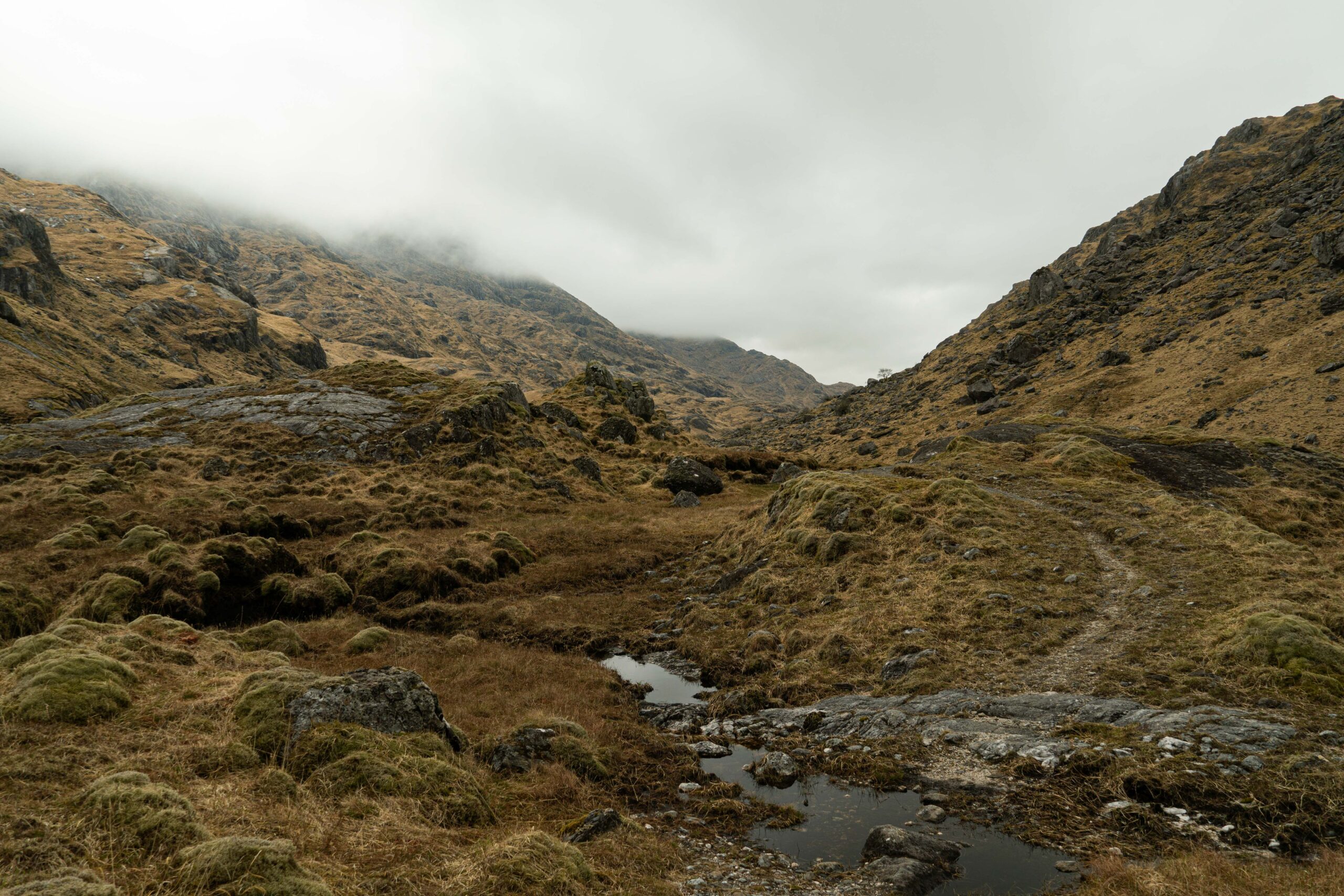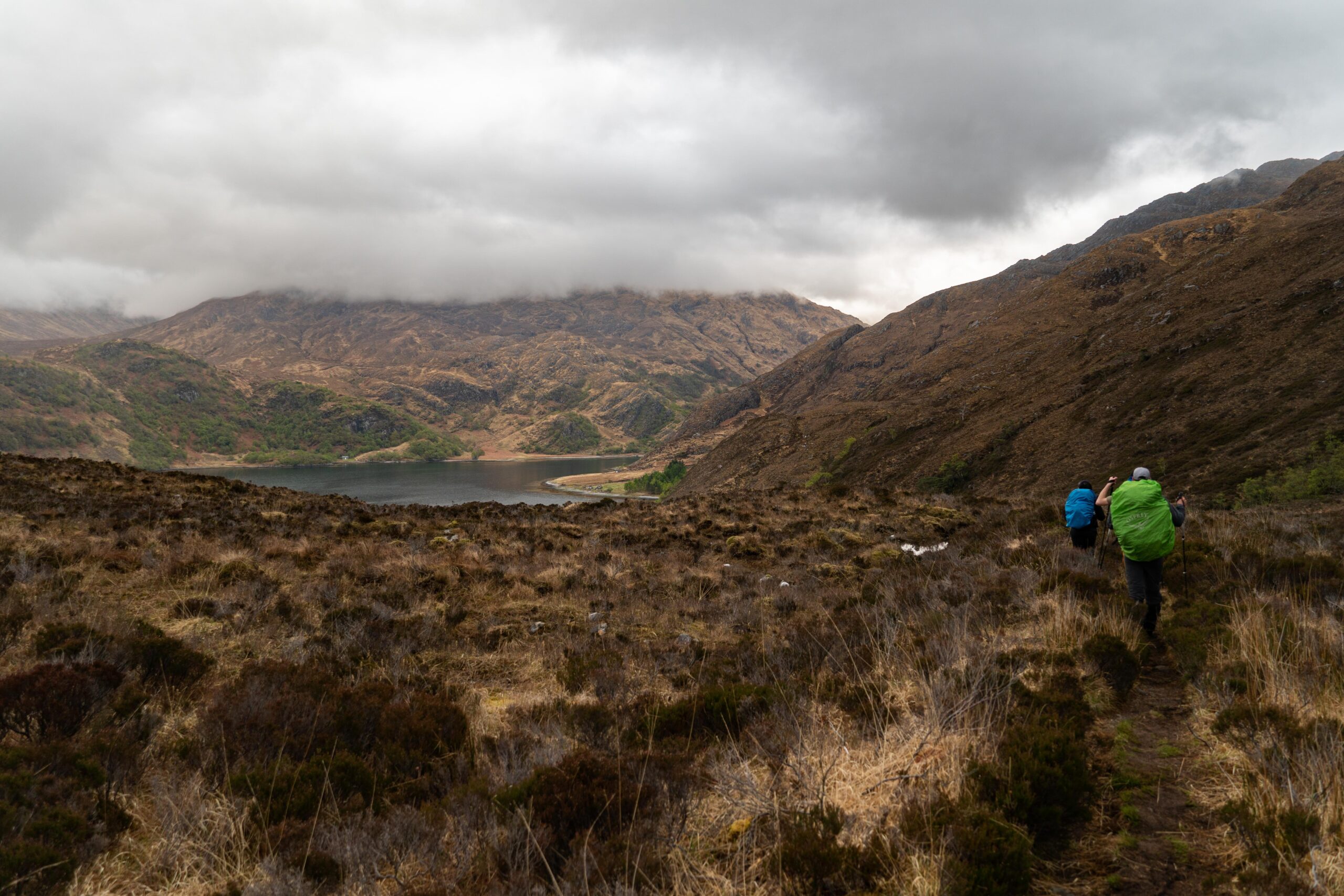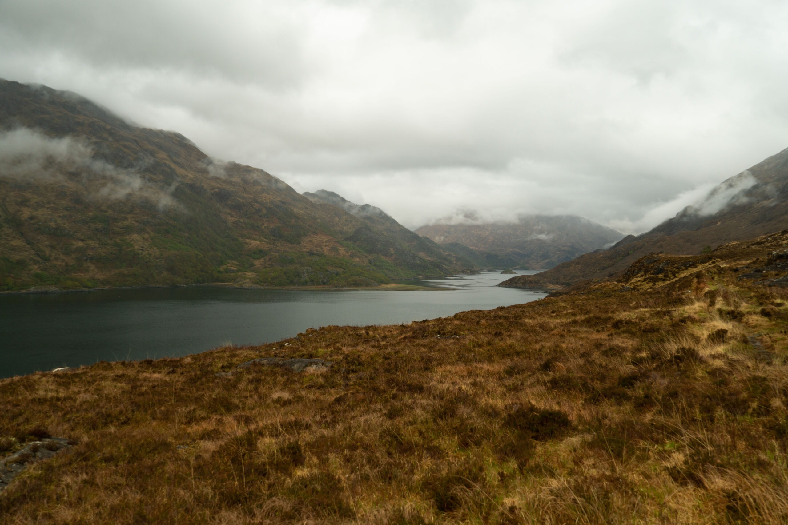 Vanaf Kinlochhourn was het een flinke klim omhoog – door een rivier die voldoende diep was dat de schoenen uitgingen – en volledig padloos door de blubber tot de top. De top van de pas was gehuld in mist en vrij mystiek. Het pad liep onder de top van de Munro door over een alpien landschap en over flinke keien. Eenmaal onder de mist was het uitzicht fantastisch! Vervolgens was het een kwestie van afdalen en nog een klein stukje langs de doorgaande weg om in Morvich uit te komen.