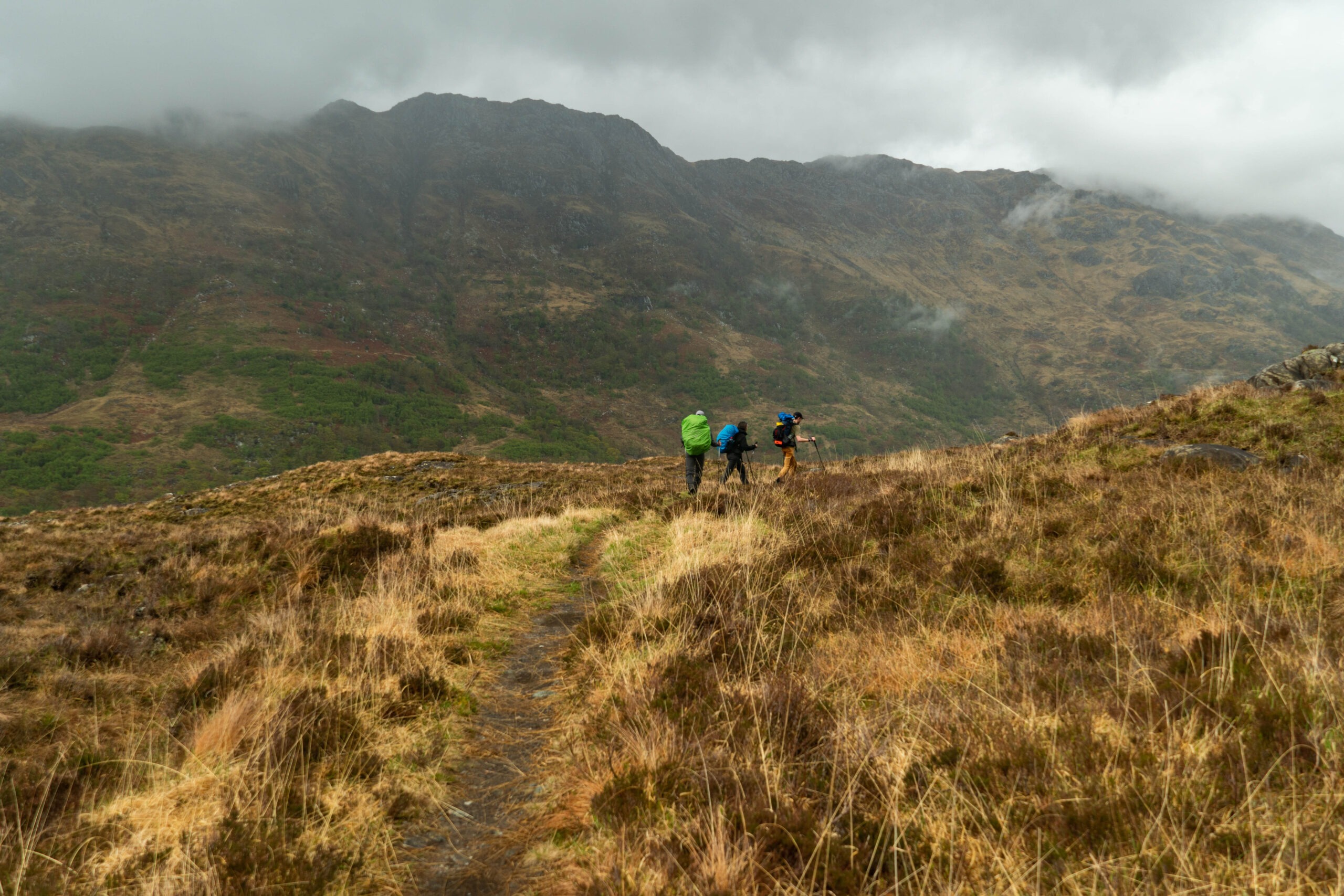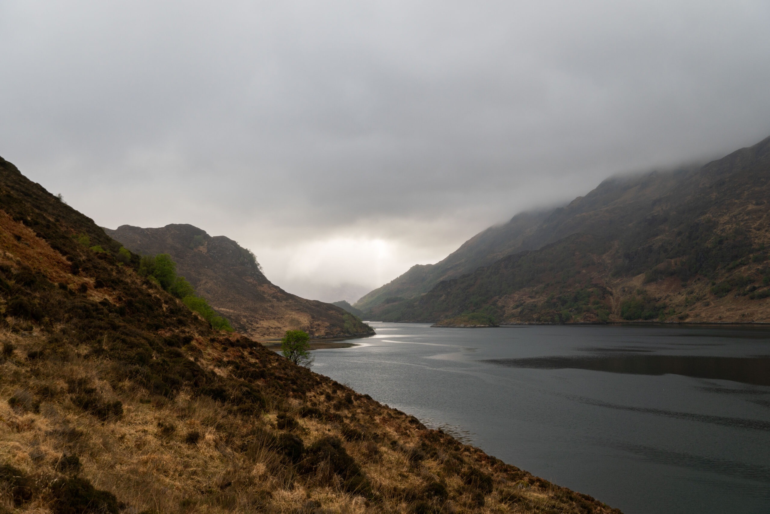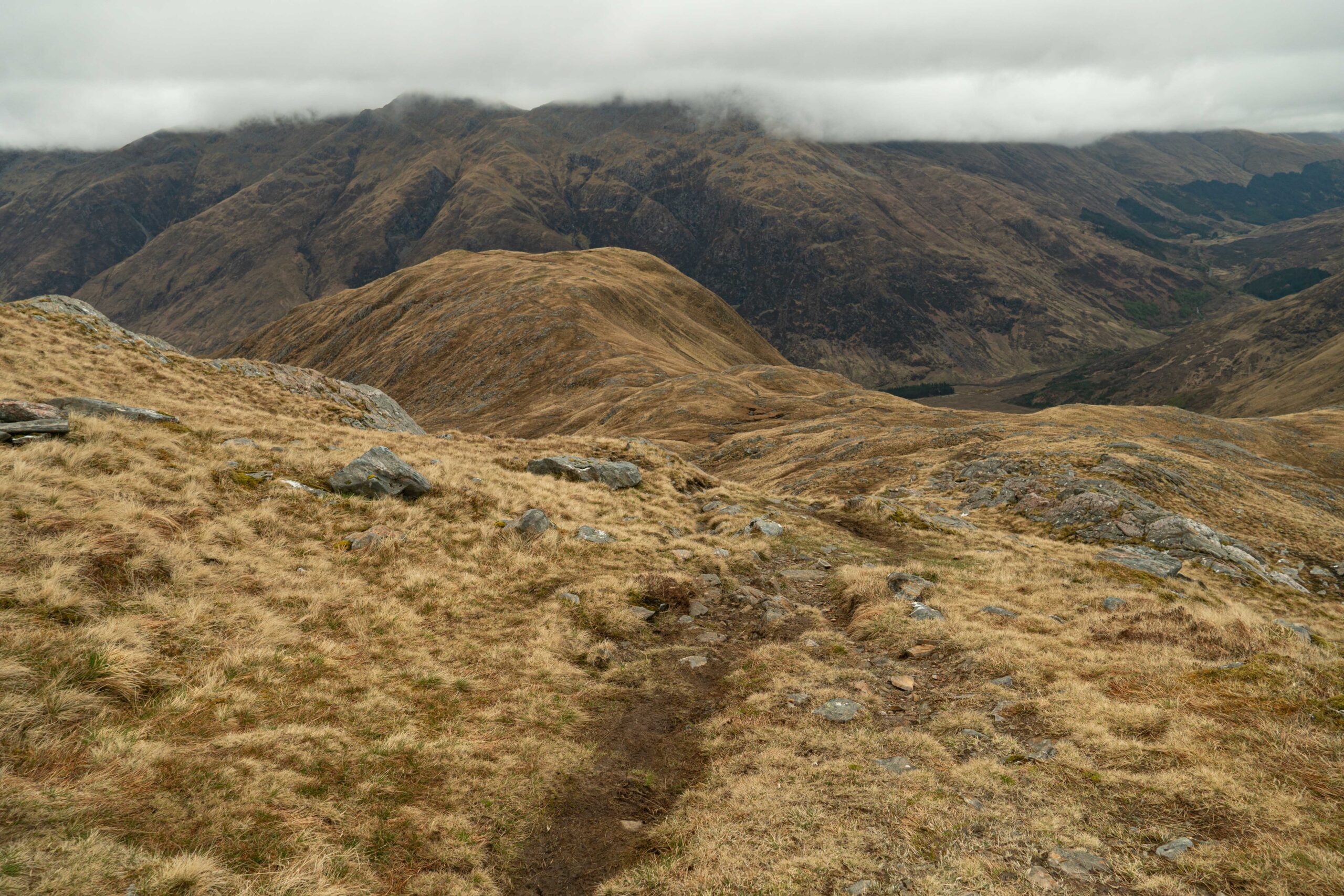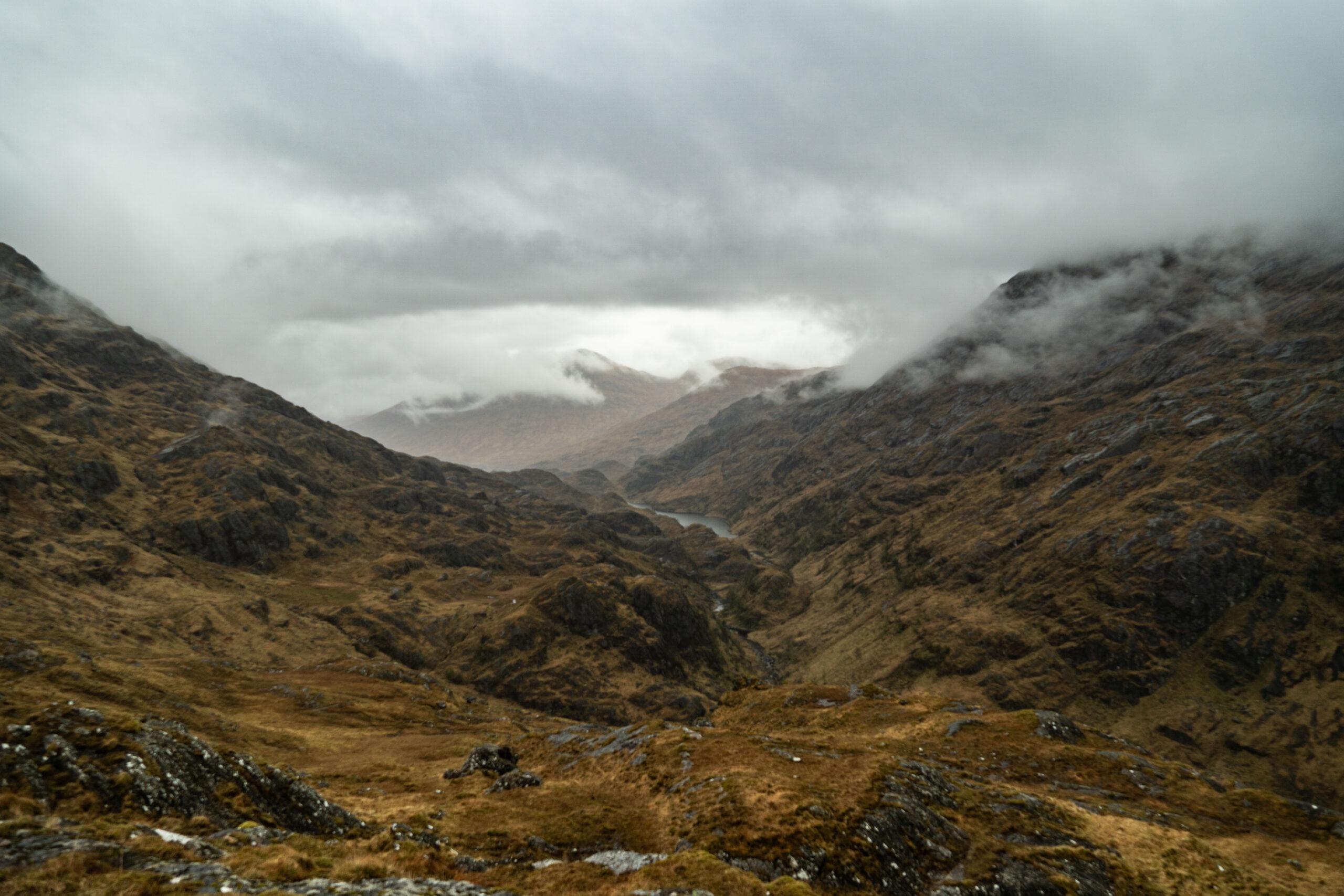 Vanaf Kinlochhourn was het een flinke klim omhoog – door een rivier die voldoende diep was dat de schoenen uitgingen – en volledig padloos door de blubber tot de top. De top van de pas was gehuld in mist en vrij mystiek. Het pad liep onder de top van de Munro door over een alpien landschap en over flinke keien. Eenmaal onder de mist was het uitzicht fantastisch! Vervolgens was het een kwestie van afdalen en nog een klein stukje langs de doorgaande weg om in Morvich uit te komen.