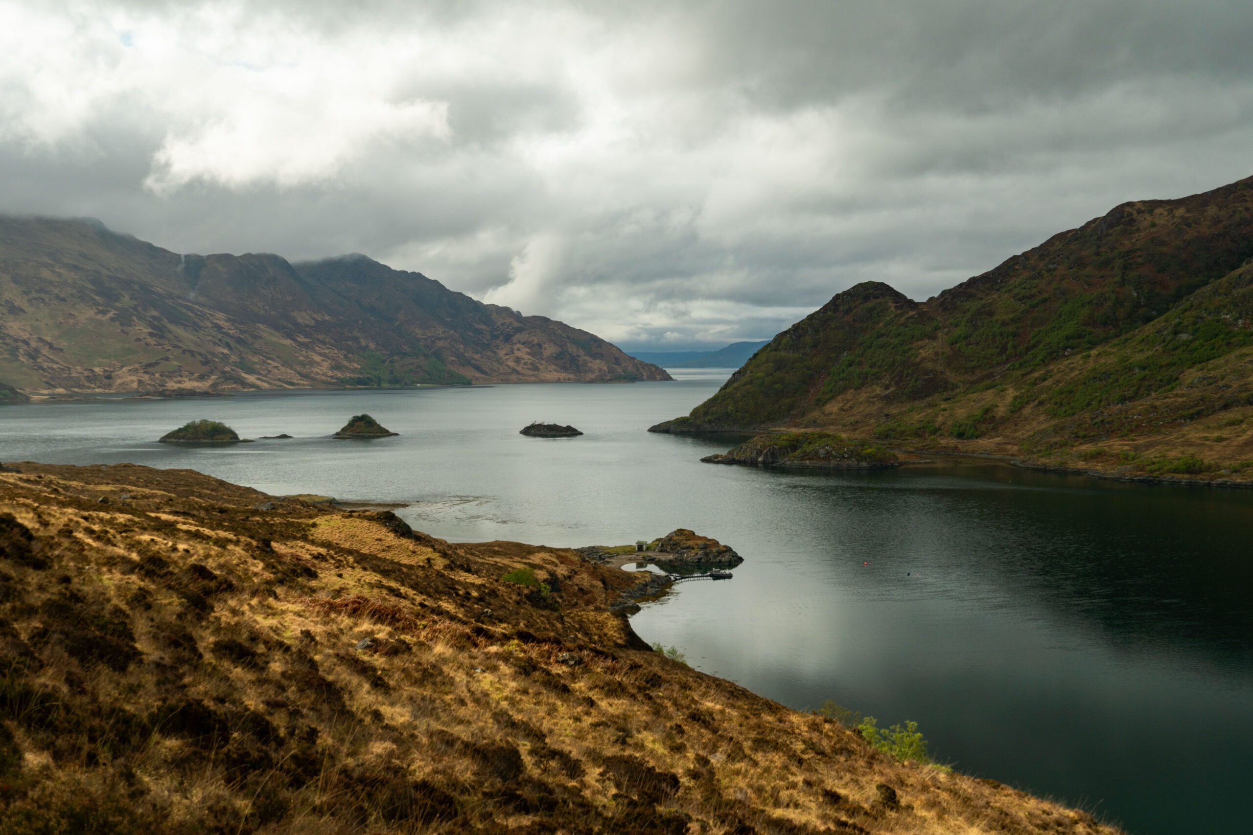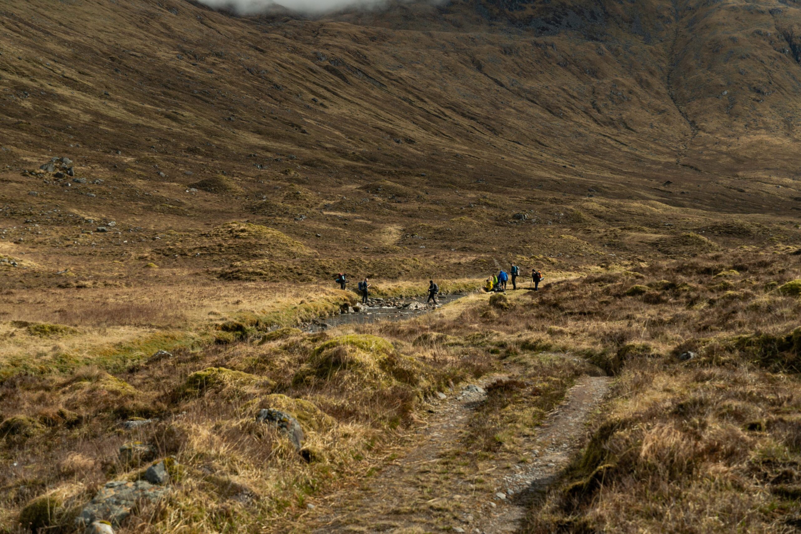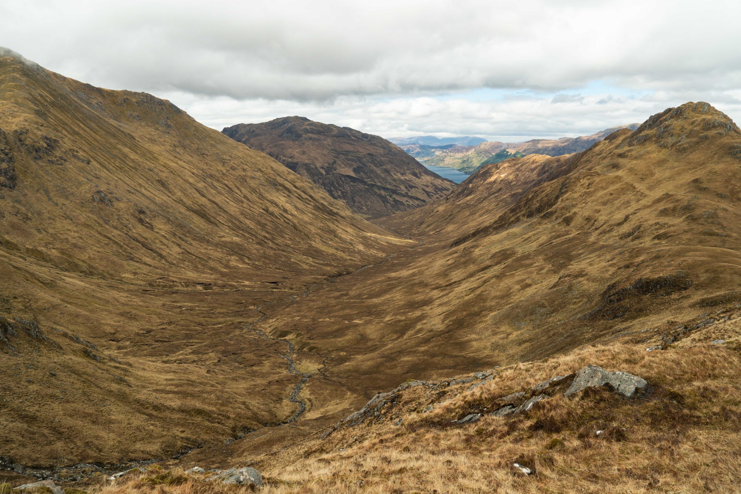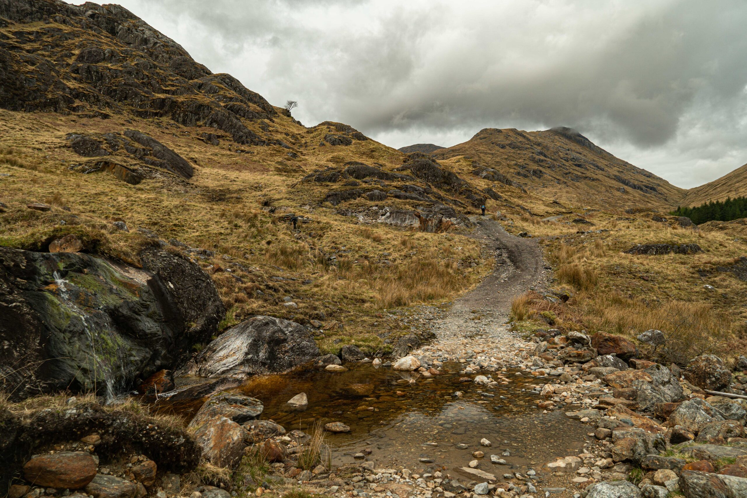 Vanaf Kinlochhourn was het een flinke klim omhoog – door een rivier die voldoende diep was dat de schoenen uitgingen – en volledig padloos door de blubber tot de top. De top van de pas was gehuld in mist en vrij mystiek. Het pad liep onder de top van de Munro door over een alpien landschap en over flinke keien. Eenmaal onder de mist was het uitzicht fantastisch! Vervolgens was het een kwestie van afdalen en nog een klein stukje langs de doorgaande weg om in Morvich uit te komen.