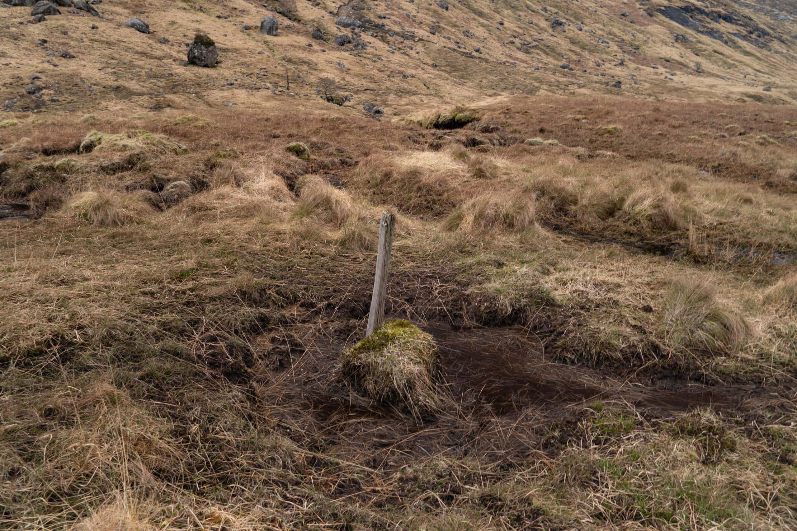 Van Sourlies was het door moerasland een stukje tot de rivier om vervolgens de rivier zo ver mogelijk te volgen: door de regen en natte ondergrond. Op een gegeven moment moesten we ‘omhoog’. Er is geen duidelijk pad, maar ik vermoed dat ik één van de moeilijkste varianten heb gekozen door helemaal tot het einde van de vallei door te lopen en vervolgens steil omhoog door het hoge gras de berg op te lopen. De uitzichten waren echter fantastisch! Boven op de top kwam ik bij een goed 4×4 pad op en de weg naar Barisdale was dan ook prima te doen.